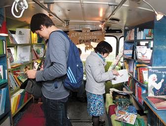 У стенда издательства «Книжники» Внутри детского книжного автобуса «Бампер»