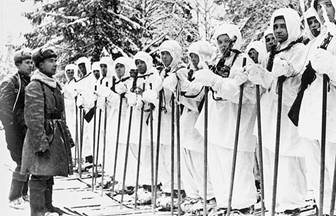 Рота автоматчиков на лыжах перед вступлением в бой. Московская область. Декабрь 1941 года