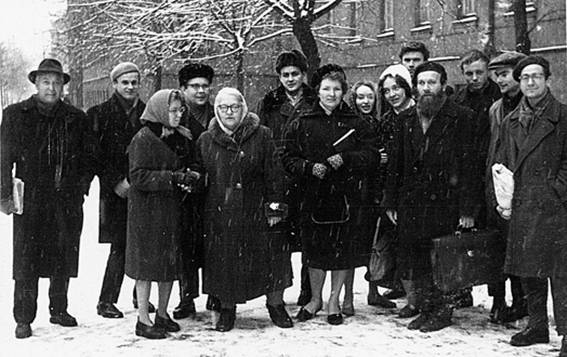 А. Д. Синявский (четвертый справа) среди преподавателей и студентов филфака Латвийского государственного университетета (четвертый слева – Л. С. Сидяков, крайний справа – Е. А. Тоддес). 1962 год