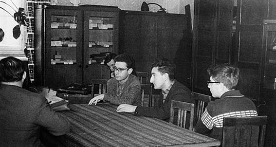 Заседание Пушкинского кружка. Слева (спиной) Л. С. Сидяков, напротив Е. А. Тоддес, Л. С. Флейшман, Р. Д. Тименчик. Рига. 1964 год