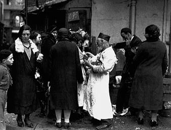 Оживленная торговля кошерной птицей у лавки резника на парижской улице Розье. Январь 1939 года