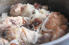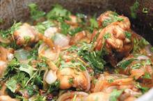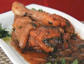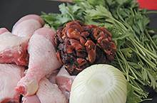 Ингредиенты: 1 курица, 3 луковицы, 5–6 зубчиков чеснока, по 3 столовых ложки мелко порубленных кинзы и петрушки, соль, молотый черный перец, корица по вкусу, треть чайной ложки тамаринда.