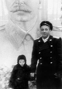 Миша Айзенберг с отцом на праздничном гулянье у портрета И. В. Сталина. Красные Ворота, Москва. Зима 1952 года