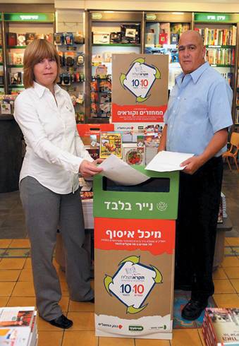Директор книготорговой сети «Стеймацкий» Ирис Барэль демонстрирует правильный способ утилизации макулатуры