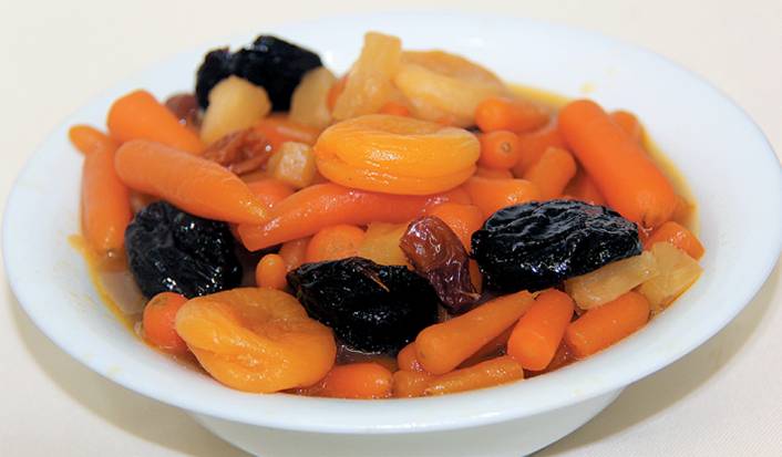 Ингредиенты: 1 кг моркови, 3 столовые ложки куриного или гусиного жира, 0,5 чайной ложки соли, 0,5 столовой ложки изюма, 1 столовая ложка чернослива, 6 столовых ложек жженого сахара, полпалочки корицы, четверть чайной ложки молотой гвоздики, 1 столовая ложка лимонного сока, 2 столовые ложки апельсиновых цукатов, 3 столовые ложки меда.