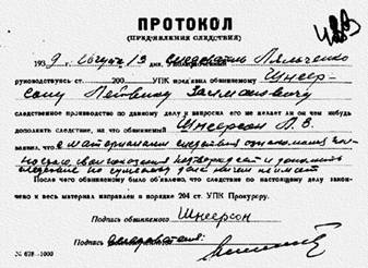 «Протокол предъявления следствия» по делу Лейвика Залмановича (Леви-Ицхока) Шнеерсона от 13 августа 1939 года