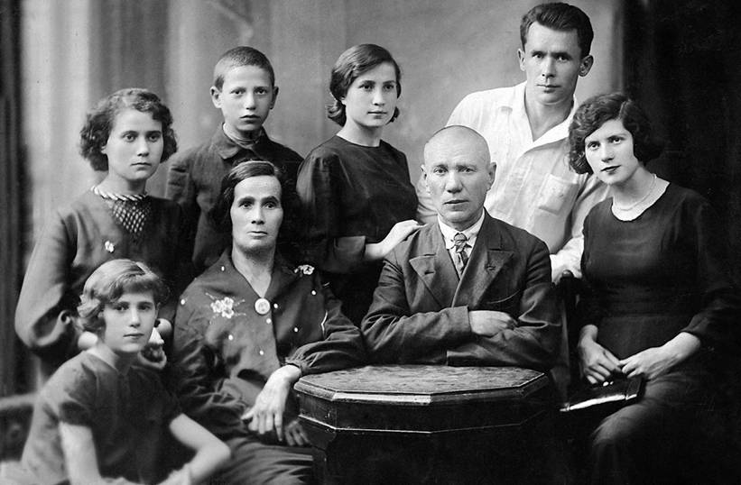 Семья Эпштейн. 1936 год. Стоят слева направо: Галина (Феша), Боря, Раиса, Анатолий Соболев, муж Беллы. Сидят: Роза, Софья, Соломон, Белла