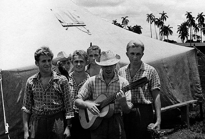 Солдаты русского экспедиционного корпуса в ковбойской форме. Павел с гитарой. Птичка — прирученный попугай. Куба. 1962 год