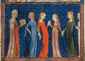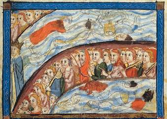 Иллюстрации из «Сараевской агады». Слева: Евреи бегут от египтян по дну расступившегося моря. Справа: Пророчица Мирьям с тимпаном в руке поет гимн Г-споду, ввергнувшему египтян в море. Барселона, Испания. Около 1350 года. Собрание Национального музея Боснии и Герцеговины в Сараево