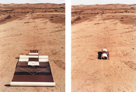 Образ выглядит универсальным, родственным ему сочтет себя любой культурный феномен. Но в случае с Аккерманом сближение очевидно. Действительность у него не создается окружением, но плетется из множества фрагментов и нитей прошлого и будущего, обрывков лиц, событий, фраз. Из создающихся отношений, молчаливых диалогов, контрастирующих образов ткется ткань его пространства, подобного не столько географической карте, сколько наслоениям геологических периодов. Цветом она напоминает пустыню Негев, в которой раскладывается «Свиток Голема».