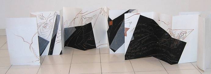 Черно-белая серия, посвященная Целану, создается как дневник-диалог с этими образами. Это не иллюстрации, а именно диалог, пусть и не на равных, создание пространства, которого пока нет, идут только его поиски. Пространство — дом искусства, в котором царит постулат Хлебникова: «Организму вымысла нужна среда правды».