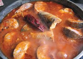 Рыбу очистить от чешуи и внутренностей, нарезать кусками примерно по 4 см и сбрызнуть их свежим лимонным соком. Для соуса в течение нескольких минут обжаривать чеснок на оливковом масле вместе с колечками острого перца. Добавить томатную пасту, еще несколько минут жарить все и затем влить столько воды, чтобы соус обрел консистенцию сметаны. После чего сразу добавить кимель, кумин, паприку и соль. Как только соус закипит, огонь уменьшить. Вылить соус в глубокую сковороду, сложить туда кусочки рыбы и тушить под крышкой с полчаса, а можно и минут сорок. Рыба, конечно, приготовится быстрее, но надо, чтобы она пропиталась ароматом специй.