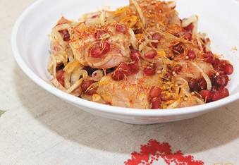 В глубокой сковороде накалить растительное масло. Жарить в нем рыбу, обвалянную в муке, которая предварительно смешана со специями. Репчатый лук нарезать тонкими кольцами и уложить на рыбу. Сделать под сковородой маленький огонь, накрыть ее крышкой и ждать, пока лук не станет мягким. После этого засыпать сверху гранатовые зерна и дать рыбе еще минут пять потомиться под крышкой.