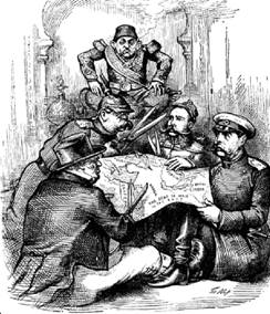 Карикатура, изображающая правителей мира, кроящих Османскую империю: «Дайте и нам поучаствовать в мирном процессе». 1877 год