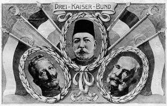 Союз трех императоров во время первой мировой войны: Вильгельм II, Мехмед V и Франц Иосиф — Германия, Османская империя и Австро-Венгрия
