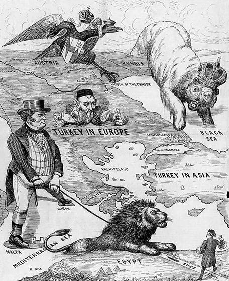окруженная Австрией (двуглавый орел), Россией (медведь с короной) и Британией