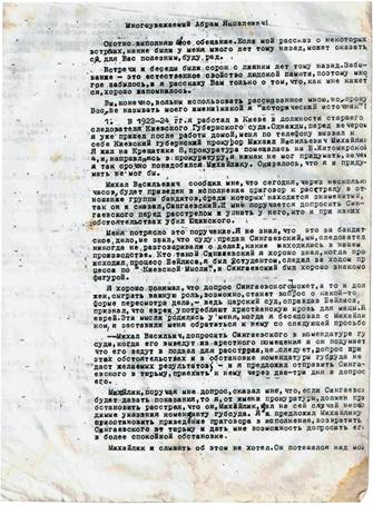 Я хорошо понимал, что допрос Сингаевского <...> может сыграть важную роль, возможно, встанет вопрос о какой-то форме пересмотра дела, — ведь царский суд, оправдав Бейлиса, признал, что евреи употребляют христианскую кровь для мацы <...>