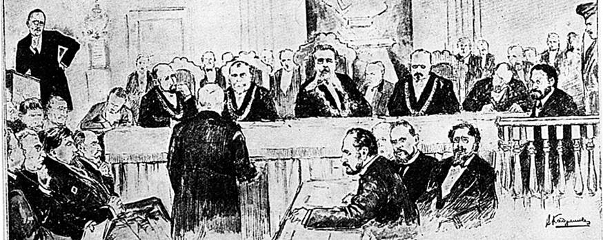 Второй состав суда. Товарищ прокурора Петербургской судебной палаты Оскар Виппер (стоит вверху слева); эксперты (сидят внизу слева): академик Павел Коковцов; гебраист, профессор Петербургской духовной академии Иван Троицкий; католический ксёндз из Ташкента Иустин Пранайтис; профессор П. В. Тихомиров; общественный деятель еврейства России, главный раввин Москвы Яков Исаевич Мазе (стоит спиной); председатель Ф. А. Болдырев (сидит в президиуме, в центре); гражданские обвинители: А. С. Шмаков (сидит внизу, третий справа), Г. Г. Замысловский (сидит внизу, второй справа); защитник О. О. Грузенберг (сидит внизу, крайний справа); защитник В. А. Маклаков (сидит внизу, четвертый справа); обвиняемый М. Бейлис (сидит справа). Рисунок из книги А. С. Тагера «Царская Россия и дело Бейлиса» (М., 1934)