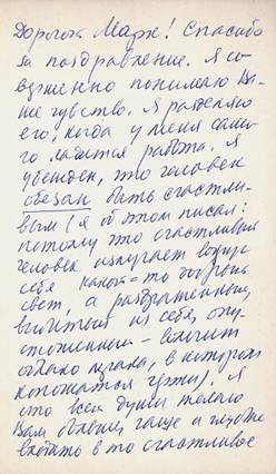 Дорогой Марк! Спасибо за теплое поздравление. Я чувствую себя обязанным пожить еще несколько лет, чтобы ободрить тех, кто значительно моложе: сколько еще лет впереди! <…>