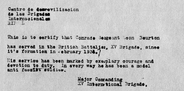 Характеристика Леона Бертона, выданная командованием 15-й интербригады в Испании. Текст гласит: «Надлежащим подтверждаю, что товарищ сержант Леон Бертон служил в Британском батальоне, в 15-й бригаде, с момента его образования в феврале 1934 года. В течение службы неизменно проявлял мужество, преданность долгу и всегда был образцовым антифашистом. Командир XV Интернациональной бригады, майор <нрзб>»