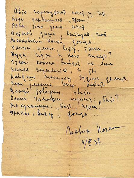 Некоторая неотделанность акростиха позволяет предположить, что написан он был экспромтом, может быть, даже на спор. Увы, ни обстоятельств написания стихотворения, ни деталей той дружбы теперь уже не узнать: довоенные дневники отца не сохранились, и расспросить его поподробнее тоже не пришлось. Все, что я мог бы написать о замечательном, рано погибшем поэте Павле Когане (1918–1942), любой и сам найдет в Интернете. Вместо этого воспользуюсь случаем и расскажу о человеке, которому посвящен акростих.