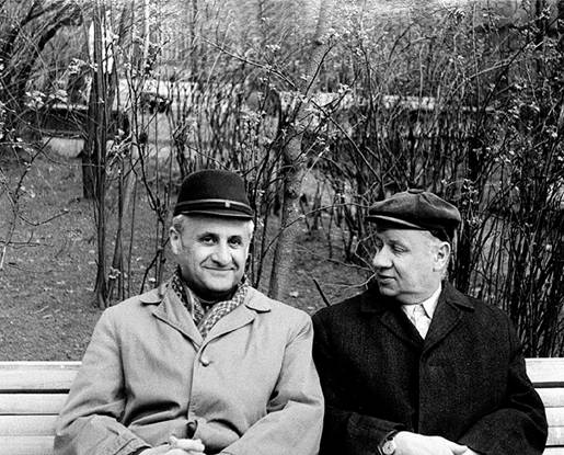 Андрей Кузнецов (слева) и Виктор Розов в садике перед домом. Москва. 1973 год
