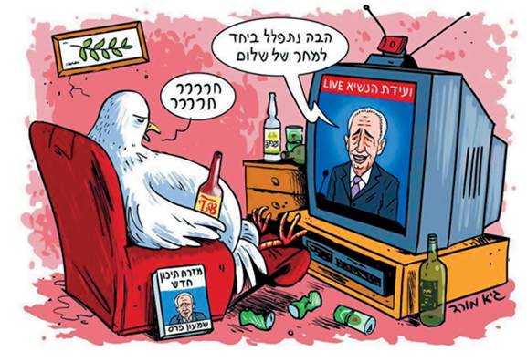Голубь мира заснул во время телетрансляции президентской пресс-конференции Шимона Переса: «Давайте все вместе помолимся за мирное будущее...» Возле спящего голубя книга Переса 20-летней давности «Новый Ближний Восток». «Йедиот ахаронот», 20 июня 2013 года