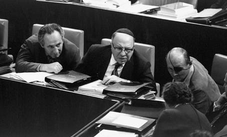 Премьер-министр Голда Меир и министры ее правительства: Шимон Перес, Йосеф Бург и Моше Даян. 4 октября 1973 года