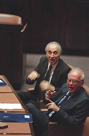 Министр иностранных дел Шимон Перес и премьер-министр Ицхак Рабин в кнессете.  4 ноября 1994 года