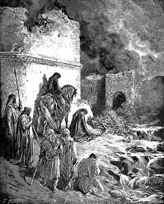 Нехемья осматривает разрушенные стены Иерусалима: «И проехал я ночью через ворота Долины перед источником Драконовым к воротам Навозным, и осмотрел я стены Иерусалима разрушенные и его ворота, сожженные огнем» (Нехемья, 2:13). Гравюра Гюстава Доре из серии «Библейские сюжеты». 1864–1866 годы