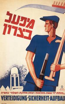 Плакат Отто Уоллиша «Оборона — безопасность — строительство»: образ Уоллиша отсылал к стиху из книги Нехемьи: «Одной рукой он созидал, другой держал оружие», благодаря чему создавалась историческая рифма с эпохой первого возвращения в Сион из вавилонского плена. Прага. 1930-е годы. Частная коллекция, Герцлия