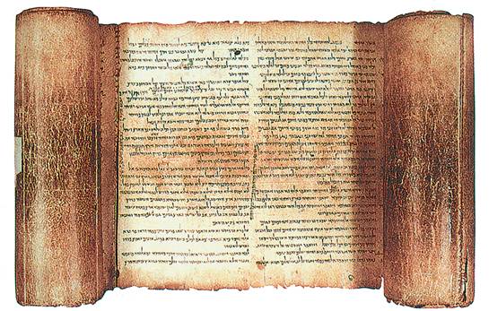 Свиток книги Йешаяу (около I века до н. э.), обнаруженный у северо-западной оконечности Мертвого моря в Кумране в 1947 году. Наиболее древняя из найденных записей цельных частей Библии. Музей Израиля, Иерусалим
