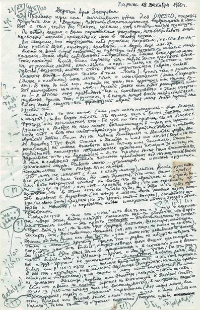 Первая страница письма Эммануила Райса Аарону Штейнбергу. Париж. 18 декабря 1960 года