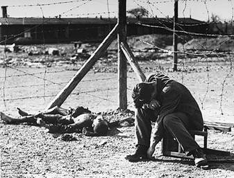 Узник Бухенвальда, оплакивающий своего друга, застреленного из огнемета во время попытки побега. 1945 год
