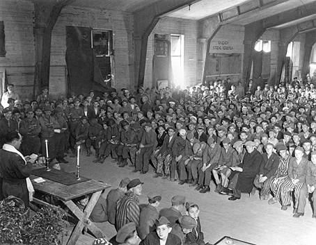Раввин американской армии Гершель Шехтер проводит богослужение перед освобожденными узниками концентрационного лагеря Бухенвальд. 1945 год