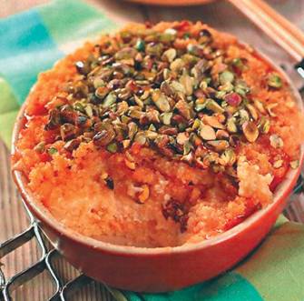 Ингредиенты: 130–200 г сливочного масла, нарезанного на мелкие куски, 1 слегка взбитое яйцо, щепотка соли, 400 г сыра рикотта, 175–200 г мягкого сыра, например моцареллы, мелко нарубленного или натертого, 350 мл меда, 2–3 щепотки нитей шафрана или молотой корицы, 120 мл воды, 1 ч. л. померанцевой воды или лимонного сока, 6 ст. ложек крупно нарубленных фисташек.