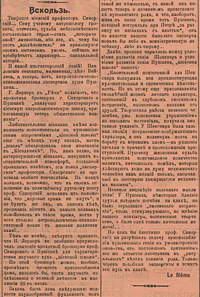 Любознательные киевляне имели возможность познакомиться с пушкинианскими откровениями «киевской школы» еще с месяц тому назад, когда «школа» обнародовала свои изыскания в «Киевлянине». Но, как видно, на интересующихся киевлян, живущих в отвратительной атмосфере, созданной кровавым наветом, эта новая «экспертиза» профессора Сикорского не произвела особого впечатления. В конце концов, возможно, что в своем отношении к величайшему русскому поэту проф. Сикорский исходил из положения, что «сраму не имут», и не будет же он, в самом деле, проявлять пиетет к памяти великих покойников в такое время, когда у него столько антропологическопсихологической возни с живыми коллективами!..
