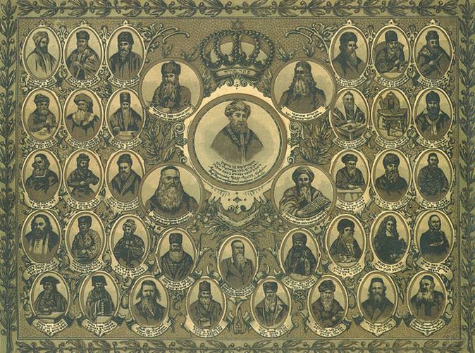 «Великие раввины Израиля». Изображены 40 раввинов, живших в Средние века и Новое время, в центре Маймонид. Олеография. Бреслау. Конец XIX — начало XX века