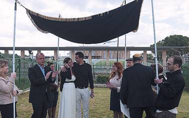 Хупа напротив здания кнессета, проведенная без согласия раввината. Молодожены выступают против монополии Главного раввината на заключение брака.