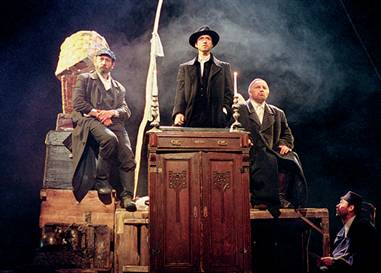 РТ Да, мы сочинили повозку из мебели, ящиков, табуреток, разного реквизита. В качестве лошади нашли шкаф. Повозка жизни, переселение народа… Дорога как метафора всего, чем жили герои романа, и чем мы жили. В дорогу мы берем все, что имеем: обычаи, историю, культуру… Что-то приобретаем по пути, что-то теряем. Я стал специально изучать быт еврейских местечек и обычаи, но заблудился во всем этом.
