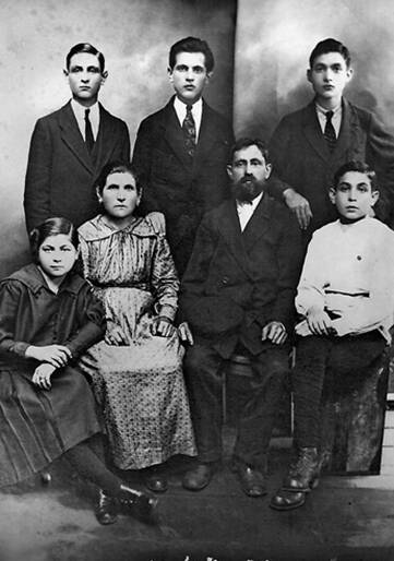 Герои «Местечкового романса». Отец Григория Кановича Соломон (Шлеймке) стоит крайний справа в окружении родителей, братьев и сестры Кановичей. Йонава. 1920 год