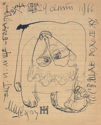 Точнее, даже не вектора, а векторов. Достаточно взглянуть на только что выпущенное издательством «Барбарис» (к открытию выставки появился пилотный тираж) издание «Текстильщики. Гостевые тетради Михаила Гробмана», которое факсимильно воспроизводит 18 тетрадок времен «оттепели» с автографами посетителей домашних выставок в комнатке Михаила Гробмана и Ирины Врубель-Голубкиной, чтобы почувствовать «двойственность» кода. Обычные школьные тетрадки за две копейки с правилами октябрят на задней обложке становятся вроде журнала посещений, где отмечаются рисунками и автографами разгульные художники, молодые поэты, их юные подруги, завсегдатаи и любопытствующие студенты. Кто-то делится тут анекдотом про Алексея Толстого, о котором прислуга сообщает: «Граф Алексей Николаевич ушли на партийное собрание»... Кто-то, как Вагрич Бахчанян, оставляет сюрреалистический рисунок — парадный портрет некоего субъекта, у которого голая стопа вместо головы... Кто-то, как Эдуард Лимонов, свидетельствует о себе: «Был тут 10 апреля 1968, и его уж нет»... Кто-то, как Игорь Ворошилов, пишет расписку, что взял в долг полтора рубля... Кто-то на ходу, как Юрий Купер, сообщает: «Миха, я очень тороплюсь. Уезжаю в Болгарию. Спасибо. Выручил» — и дальше печатными буквами: «в первый раз за границу». Россыпь почеркушек сделана явно не без напоминания хозяина. Гробман к тому же не забывает аккуратнейшим почерком тетрадочки нумеровать, а в конце так же старательно прилагает список всех расписавшихся с расшифровкой имен и рода занятий. Но, похоже, этот аккуратист и прирожденный архивист вдохновляется отнюдь не Плюшкиным и даже не парижскими маршанами начала ХХ века, а футуристическими книжками. В конце концов, мог бы купить и толстые тетрадки. Но тоненькие, согласитесь, с рисунком тушью Бориса Турецкого или вязью шрифтов от Михаила Шварцмана больше походят на самодельные книги Алексея Крученых, Ольги Розановой или Наталии Гончаровой...