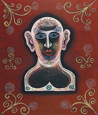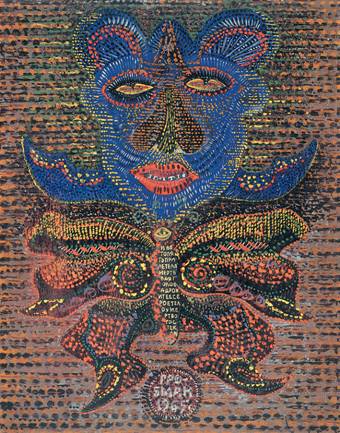 Впрочем, если начнете смотреть экспозицию с начала, то бишь с «Москвы, 1960-х», то понять, что за «гвозди» имел в виду тот давний зритель, будет намного сложнее. Наоборот, тут чудеса творения: фантастическая огромная рыба Левиафан замерла в небе над желтыми холмами и силуэтами парусников в море. Здесь волшебный синий бык с птичьими лапами стоит меж месяцем и солнцем в «Лунной ночи» (1962). Тут огромные бабочки становятся то символом мимолетности жизни, то образом неотвратимой смерти («Мертвая голова», 1965). Здесь «Фарфоровый человек» (1965), нарисованный среди декоративных фольклорных завитков, вроде бы условно-схематичный, вдруг завораживает пульсацией розового контура и созвездий из солнечных точек на щеках. Не надо быть семи пядей во лбу, чтобы сообразить, что перед нами не изображение, а обозначение таинств сотворения мира. Знаки, отсылающие к библейским сюжетам, хасидским притчам, образам народного орнамента и геометрии супрематического космоса, прочитывают мир как череду мистических символов... Пройдет совсем немного времени, и уже в Иерусалиме в 1-м манифесте группы «Левиафан» (1976) Гробман назовет три кита, на которых собирается строить новое еврейское искусство: примитив, символ, буква, — и объявит, что «народность и религиозность — две колеи нашей дороги».