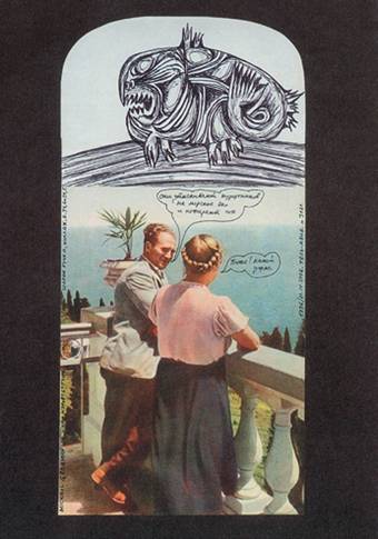 «Гробмана картинки / Словно гвоздь в ботинке», — сообщает один из посетителей домашней выставки в «Текстилях» (если вспомнить название стихотворения 1969 года Игоря Холина) в очередной тетрадочке в марте 1966 года. Надо признать, это определение остается вполне актуальным и по сей день, в частности, для четырех выставок Михаила Гробмана в Ермолаевском переулке. Особенно если вы отправитесь ее смотреть не с пятого этажа, как разумные люди, а в обратном порядке — снизу вверх. Тогда полный набор «гвоздей в ботинке» вам обеспечен. Тут вам и носатые персонажи со лбами питекантропов, радостно выводящие слово «дурак» или чего покрепче вместо граффити, и гротескные коллажи (полигражи, как называет их Гробман) из обложек книжек 1950-х годов, в которых «высокий» штиль официальной идеологии снижается солеными простонародными шутками... И лирический сюжет на тему «Израильская левая птичка беседует с арабским интеллектуалом» (2002), больше смахивающий на злую карикатуру...