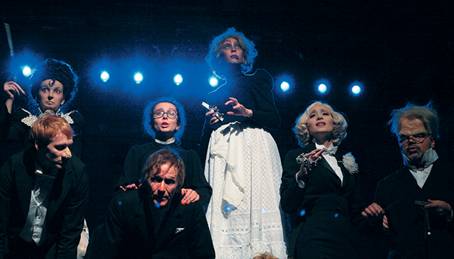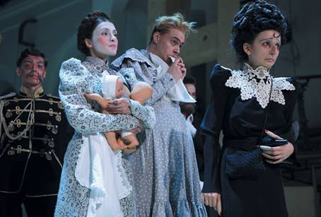 Так что мы можем быть совершенно спокойны: бальзаковские заметки о Бердичеве не были источником вдохновения Крымова. И если режиссер хоть что-то заимствует у Бальзака, то, кажется, только метод портретирования персонажей посредством создания для каждого из них характерной маски. Однако этот метод Крымов сознательно утрирует, доводя до предельной точки театрализации. Как следствие, вместо благовоспитанных дам в изящных платьях и офицеров с благородными манерами, какими по фото раннего МХТ мы привыкли представлять себе персонажей «Трех сестер», в спектакле Крымова семейство Прозоровых и их гости больше напоминают либо озлобленных цирковых паяцев, либо фриков, изуродованных сабельными шрамами, дурной наследственностью и вредными привычками.