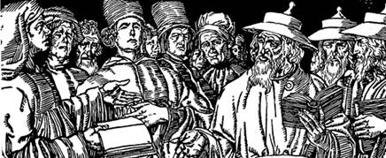Диспут между иудеями и христианами. Гравюра (фрагмент). Германия. XV век