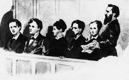 Подсудимые на процессе “1 марта”. Слева направо: Н. Рысаков, Т. Михайлов, Г. Гельфман, Н. Кибальчич, С. Перовская, А. Желябов. Рисунок А. А. Насветевича.