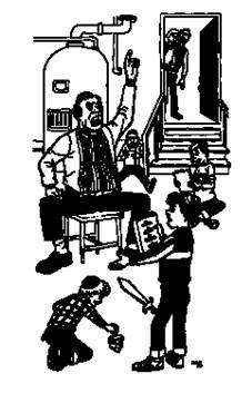 Дяде Ошеру было нелегко спуститься в подвал. Ему пришлось нагнуться и втянуть живот, чтобы не разбить голову и не застрять между узкими ступеньками. Как бы то ни было, вскоре он предстал перед ребятами.