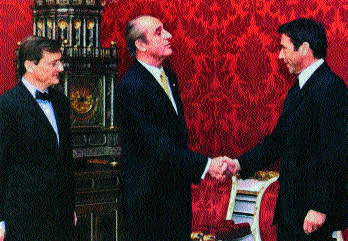 Президент Клестиль (в центре) пожимает руку Хайдеру (справа) и Шусселю (слева) после подписания ими соглашения.