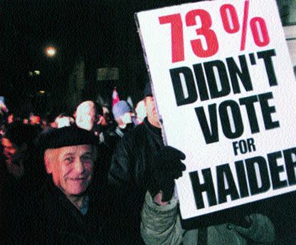 Теперь многие австрийцы не замедлили дистанцироваться от Хайдера и его партии. Более 15 тысяч демонстрантов заполнили площадь Хельденплатц, на которой Гитлер, войдя в Вену в 1938 году, выступил перед устроившими ему восторженную встречу толпами народа. Демонстранты размахивали плакатами и клеймили позором новую коалицию, сравнивая созданное правительство с фашистским режимом 1934 года, подготовившим почву для аншлюса. «Хайдер стоит за расизм и нетерпимость», – заявила 26-летняя писательница Сандра, которая несла плакат, гласивший: 73% австрийцев не голосовали за Хайдера». Другие участники демонстрации придерживались менее критической точки зрения. «Хайдер – революционер, он смело идет в контратаку, а для Австрии это редкость, – заявил 40-летний Петер, техник по профессии. – Допускаю, что он симпатизирует нацистам, ну и что из этого? Можно сказать, что он сторонник Робеспьера. И то, и другое – давнее прошлое!».